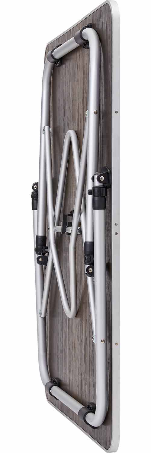 Die Tischplatte aus Polypropylen in Holzoptik ist nicht nur robust, sondern auch pflegeleicht und langlebig. Sie bietet dir ausreichend Platz für gemeinsame Mahlzeiten oder Spielabende. Das Aluminiumgestell und die Aluminiumrohre mit den Durchmessern 21 mm und 25,5 mm sind leicht, aber dennoch stabil genug, um eine Belastung von bis zu 30 kg zu tragen. Der Campingtisch lässt sich einfach und bequem zusammenklappen und hat ein kompaktes Packmaß, was ihn leicht zu transportieren und zu verstauen lässt.