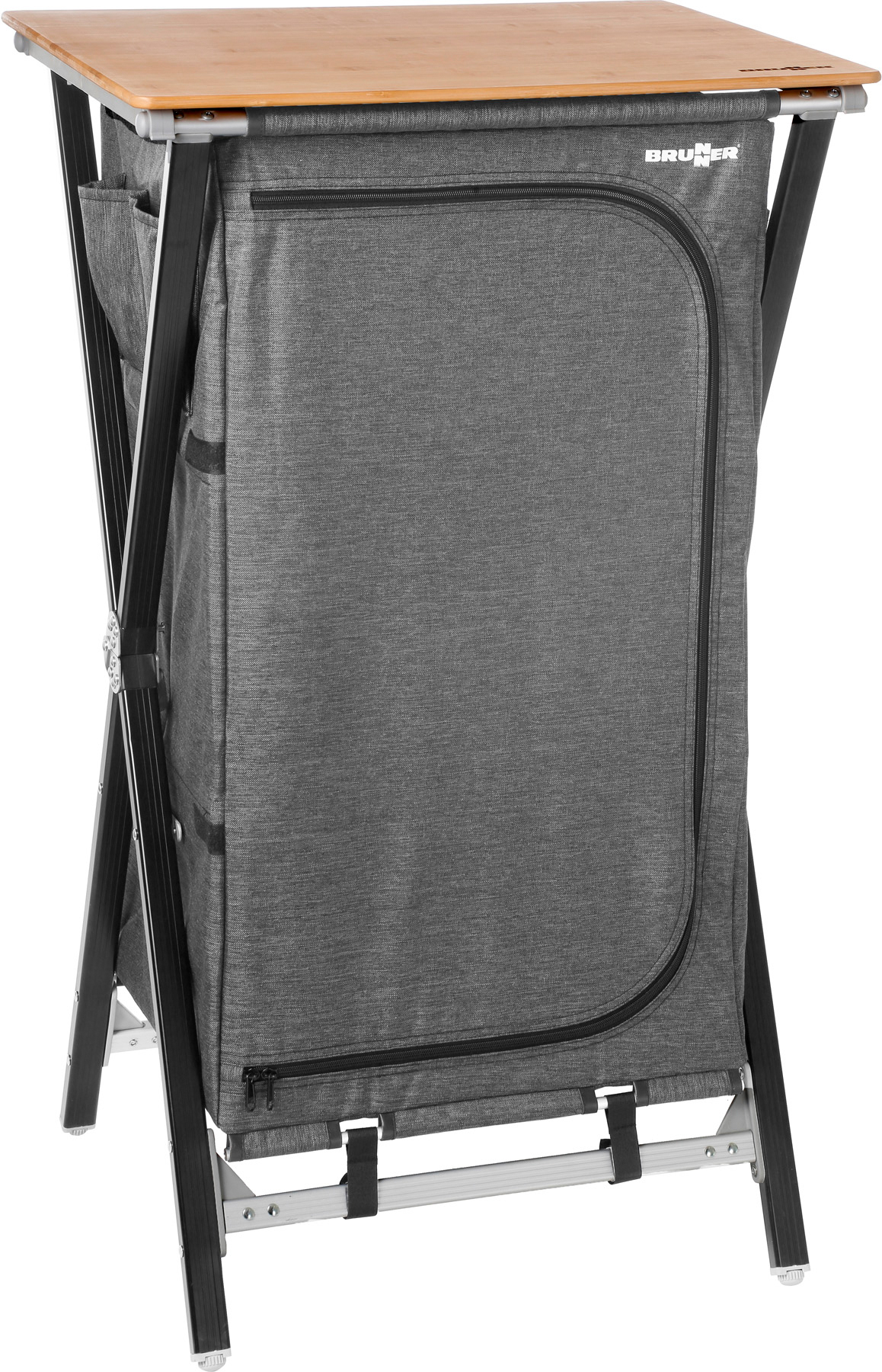 Stabile Vielzweckschränke mit CROSS Rahmen aus Alu-Rechteckprofil und zentralem Metallgelenk. Alle Füße sind höhenverstellbar. Mit 3 bzw. 4 Innenablagen und einer obenliegenden Arbeitsplatte aus Bambus. Die Schränke lassen sich ohne zusätzliches Befestigungsmaterial – mountless – einfach auf- und abbauen, die Außenhaut und Ablagen aus ansprechendem grauen, robustem Polyester bleiben auch im zusammengeklappten Zustand mit dem außenliegenden Gestell verbunden. Inklusive Tragetasche. Mit 4 Innenablagen, Windschutz und seitlichen Utensilientaschen.