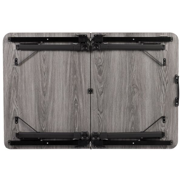 Dieser Campingtisch überzeugt mit seiner platzsparenden, vielseitigen Konstruktion und einer eleganten Tischplatte im „Classic Oak“-Design.