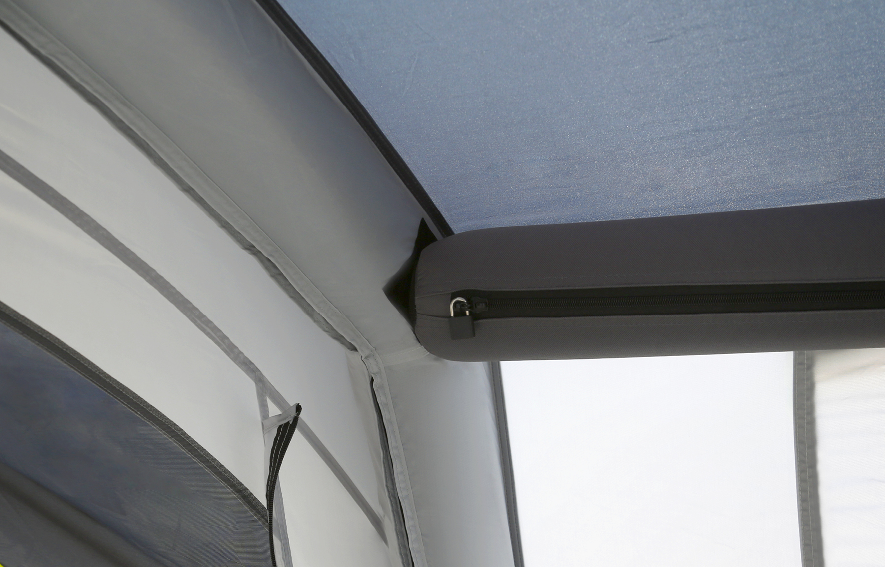 Freistehendes Buszelt mit aufblasbarem A.I.R. Tech Luftgerüst (2 Bögen). Verbindungsschleuse mit direktem Zugang zum Fahrzeug.