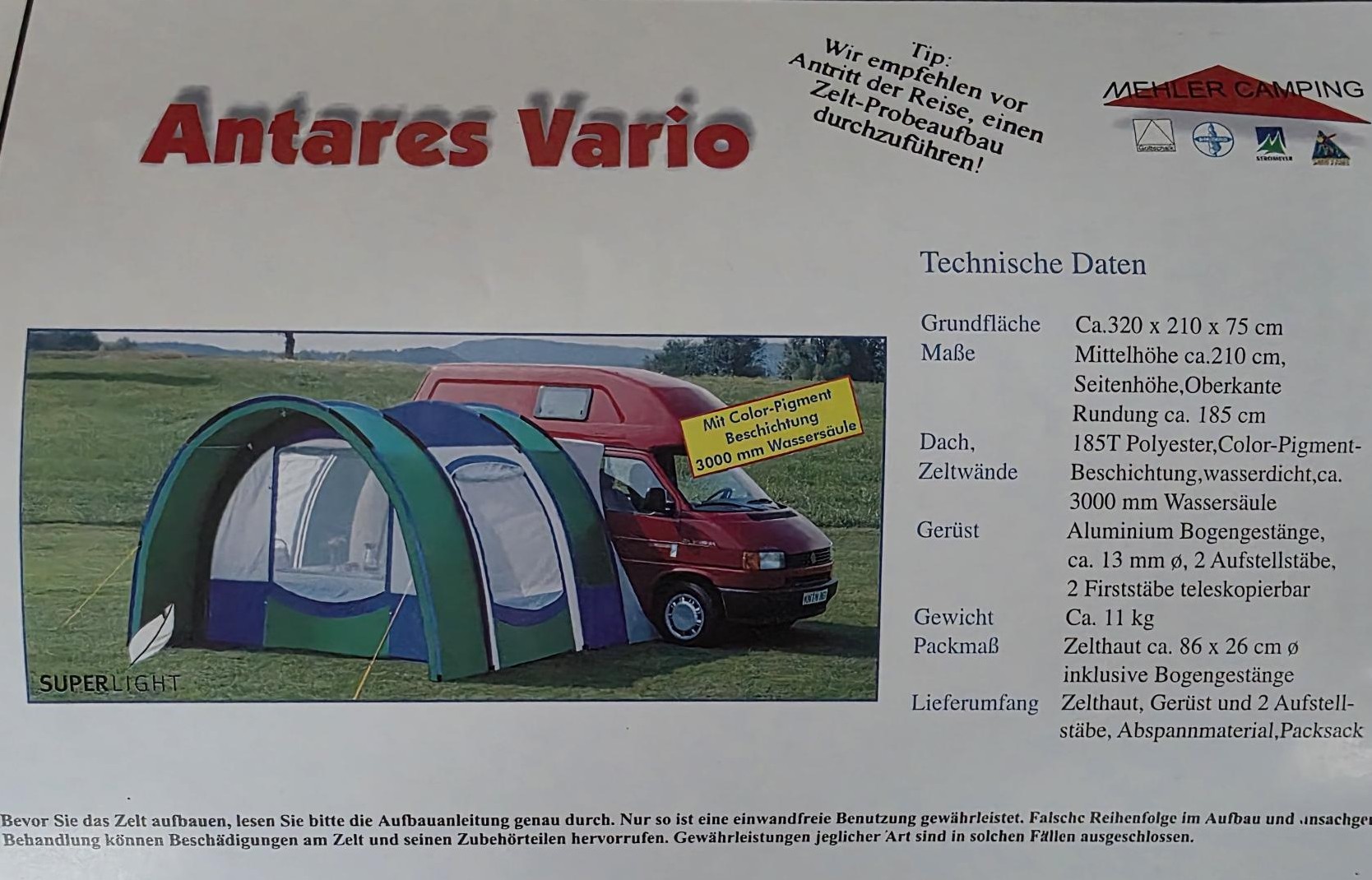 Inhalt: Zelt / Abspannmaterial / PacksackMaterial: 100% PolyesterGrundfläche: 320 x 210 x 75 cmMittelhöhe: 210 cmSeitenhöhe…