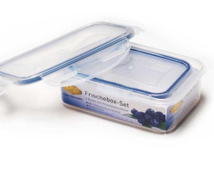 2 Frischhalteboxen mit Schnellverschluss an allen Seiten und Silikonring im Deckel.
