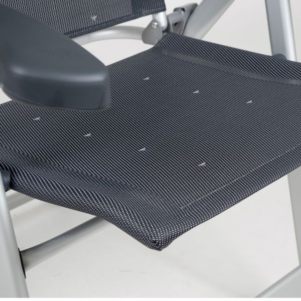 Der Sitz besteht aus Textilene und ist somit witterungsbeständig und besonders leicht zu reinigen.
