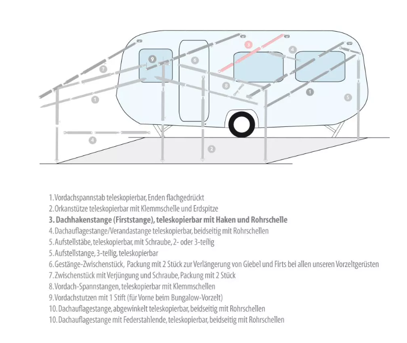 Die Dachhaken- oder Firststange ist eine Zusatzstange, welche zur zusätzlichen Stabilisierung des Vorzeltdachs verwendet wird.