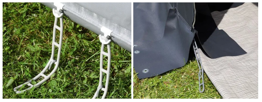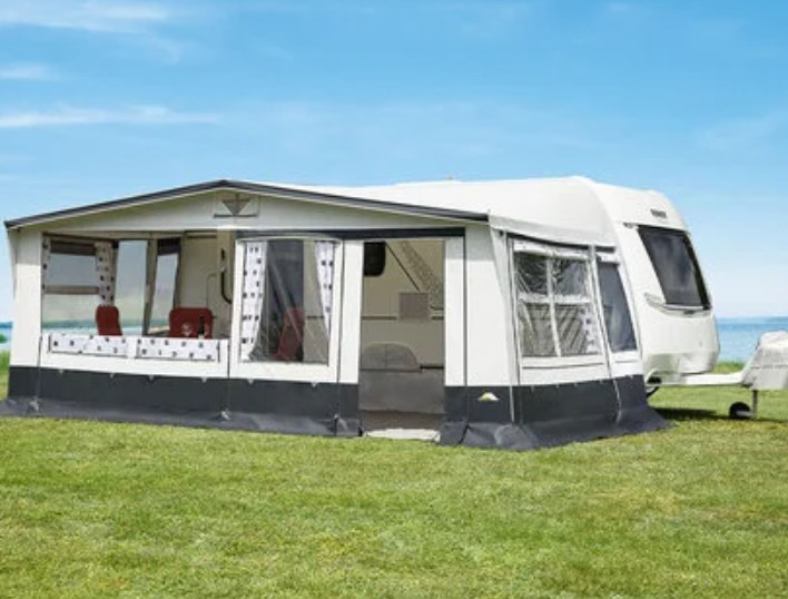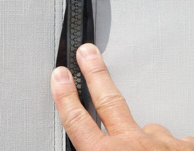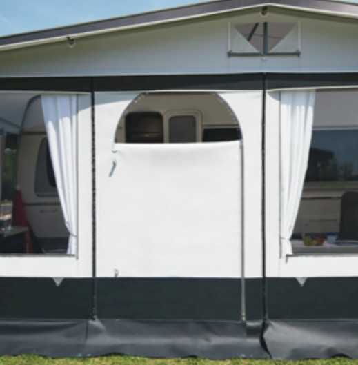 3-teilig; alle Segmente lassen sich herausnehmen und gegeneinander tauschen; somit Eingangstür an jede Position der Vorderwand versetzbar; Eingangstür hochrollbar; Fenster mit Fensterklappen und Reißverschluss, zusätzlich mit waagerechtem Reißverschluss unterhalb der Fensterklappen verschließbar; alle senkrechten Reißverschlüsse der Fensterklappen mit zusätzlicher Abdeckung; Verandaeffekt; waagerechte und senkrechte Hohlsäume mit Klettverschluss; Taschen für Verandastangen mit Klettverschlüssen. Optionale Rundbogentür in der Vorderwand gegen Aufpreis erhältlich.