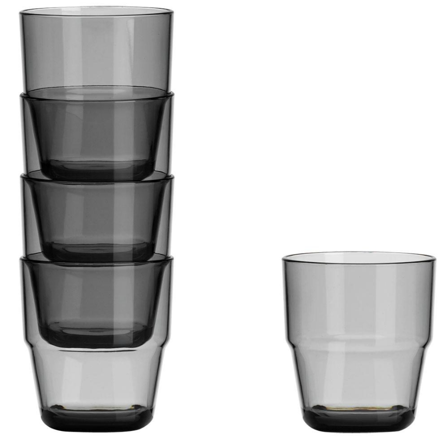 Das Gläserset Smoke von Flamefield beinhaltet vier grau-transparente Gläser, die sich zum Verstauen stapeln lassen.