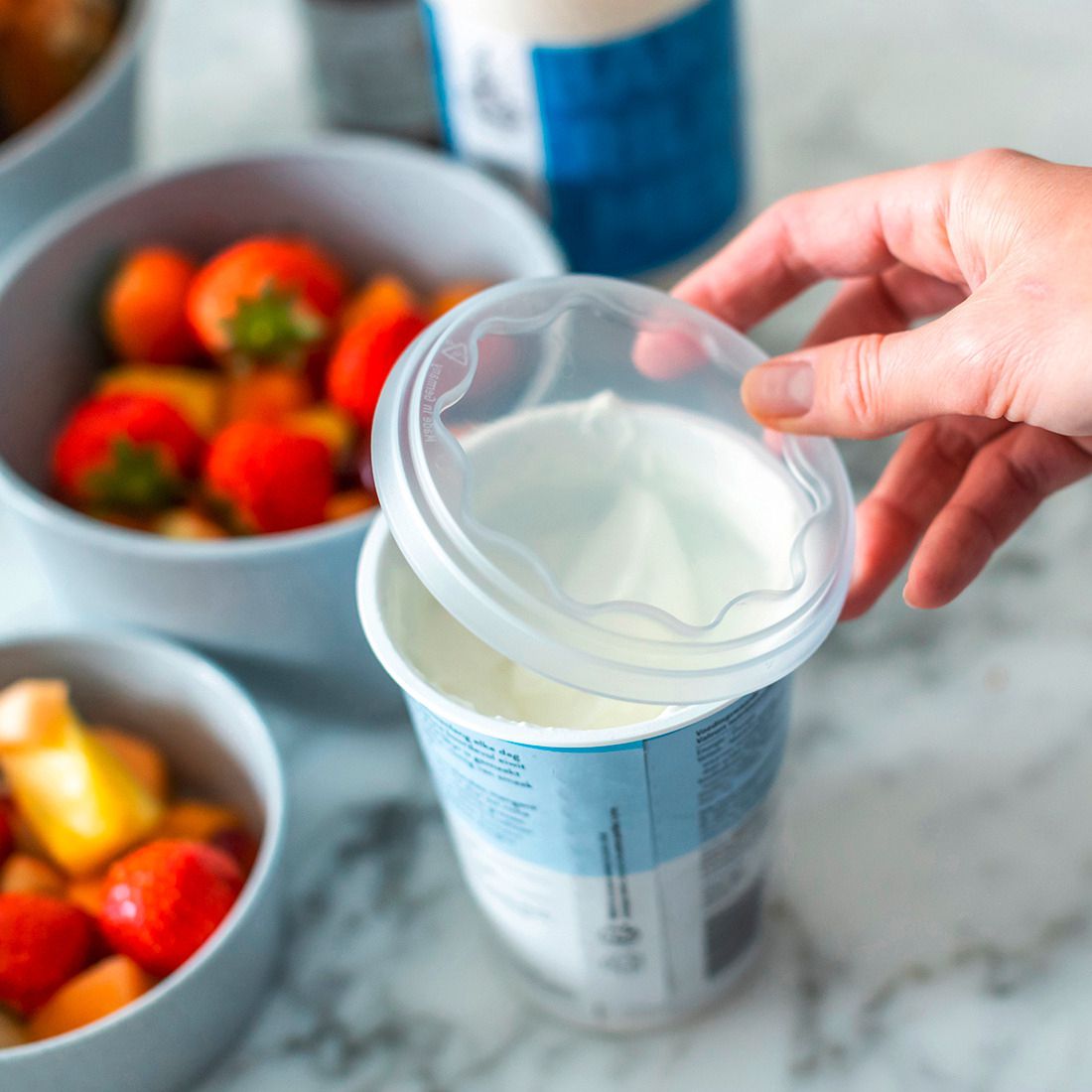Der Deckel besteht aus flexiblem Kunststoff und ist sehr einfach von Hand oder in der Spülmaschine zu reinigen. Auch für den Transport der Joghurtbecher vom Einkaufsmarkt nach Hause ist der Deckel ein zuverlässiger Schutz.