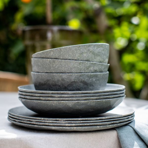 Die facettierten Teller sind wie eine frische Sommerbrise beim Outdoor-Lunch oder Terrassen-Dinner und halten auch turbulenten Feiern ohne jeden Scherbenhaufen stand. Ihre solide Materialität und die modernen Farben vermitteln stets das gute Gefühl eines schön gedeckten Tisches und bleiben dank ihrer schweren Qualität selbst bei einem kräftigen Windstoß stets standfest.
