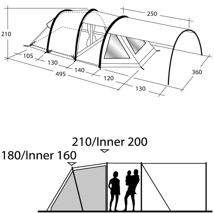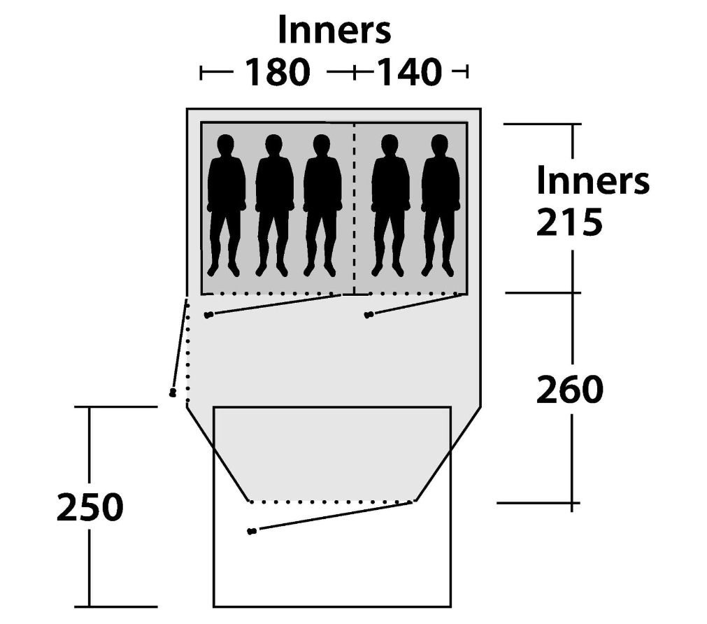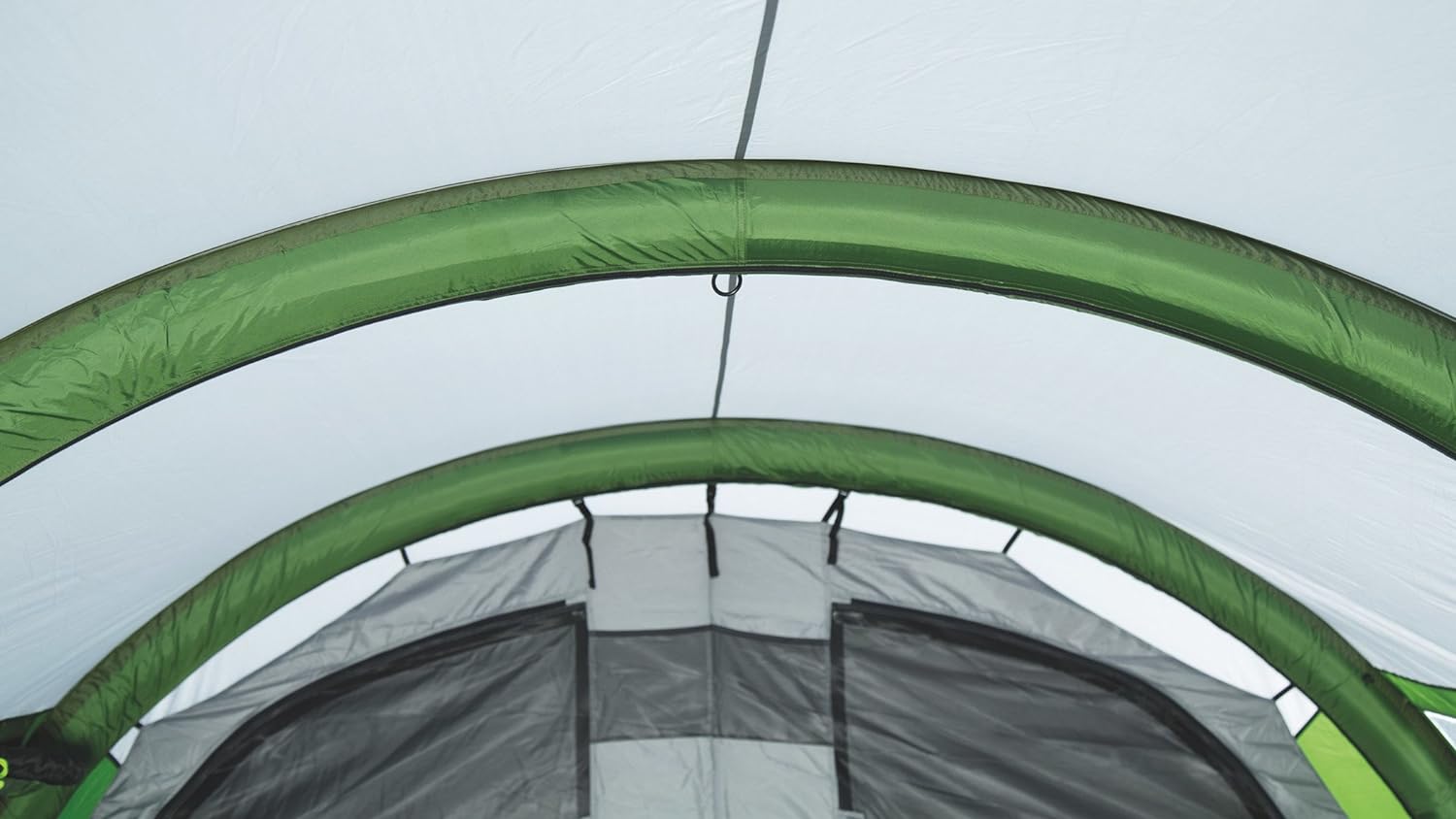 Das geräumige Tunnelzelt Roswell verfügt über eine zweigeteilte, an den großen Wohnraum angrenzende Schlafkabinen, in denen 5 Personen komfortabel untergebracht werden können.