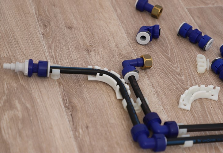 - Montage durch einfaches Einstecken des Rohres in die UniQuick-Fittings, ohne Schrauben, Kleben oder Schweißen.
