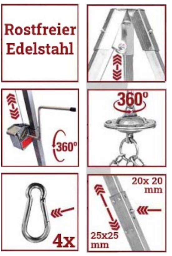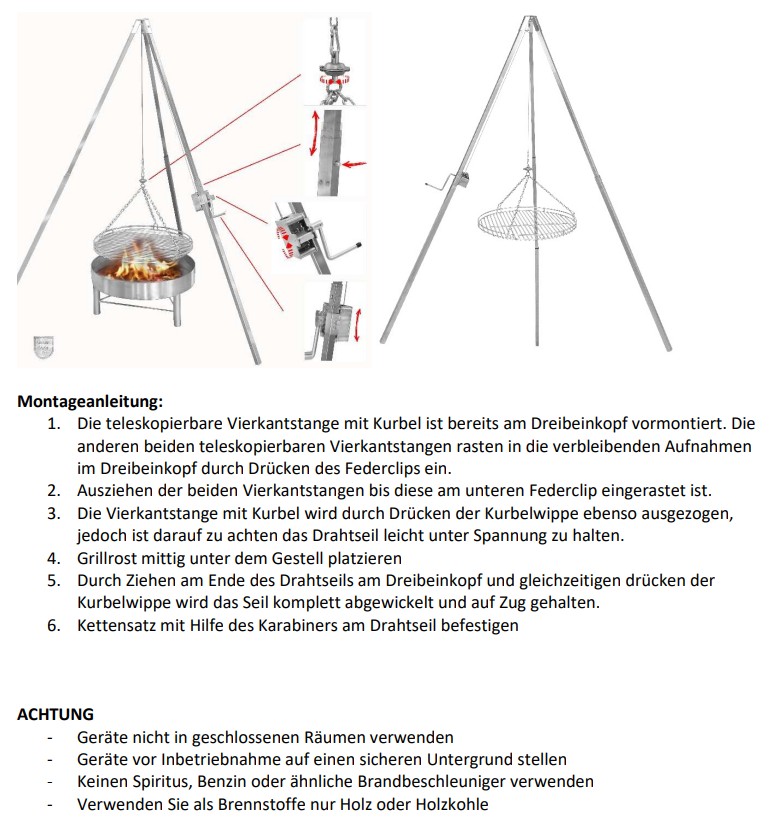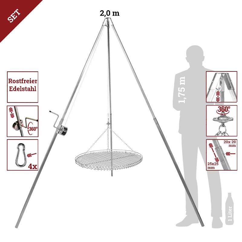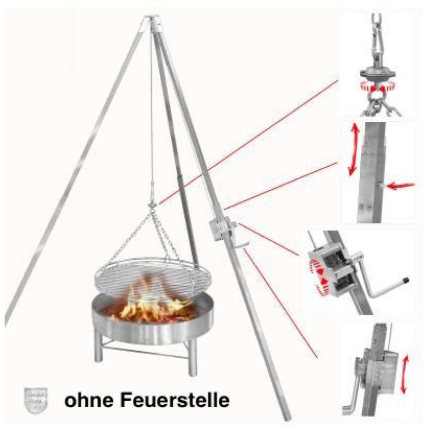 Dreibeingrill komplett aus Edelstahl mit teleskopierbaren Standrohren sowie Grillrost. Kurbel für Höhenverstellung, Aufhängung und Seilwirbel.