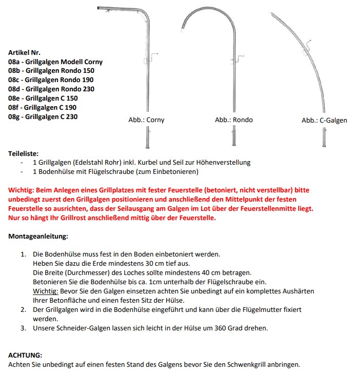 Inklusive Standrohr aus Edelstahl zum Einbetonieren. Das Stahlseil läuft über Rollen außerhalb des Grillgalgens. Der Grill verfügt über eine Kurbel für einfache Rosthöhenverstellung. Der Grill ist komplett aus Edelstahl gefertigt.