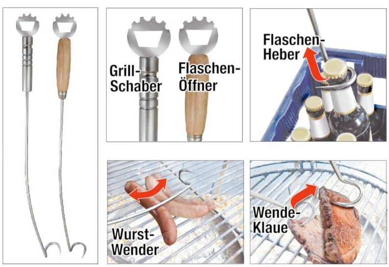 Mit unserem innovativen Alleskönner haben Sie alles jederzeit im Griff. Mit der Wendeklaue PLUS aus lebensmittelechtem Edelstahl haben Sie nicht nur Ihr Grillgut im Griff, sondern auch stets Flaschenöffner und Grillschaber zur Hand. Mit der vorne angebrachten Spitze piksen Sie leicht in Ihr Fleisch, um es zu drehen. Der speziell abgeflachte Stab in Verbindung mit den Riffelungen der Unterseite bietet Ihnen die Möglichkeit, auch Würstchen zu drehen. Der vordere Greifhaken ist so geformt, dass Sie bequem eine Flasche aus einem Kasten entnehmen können.