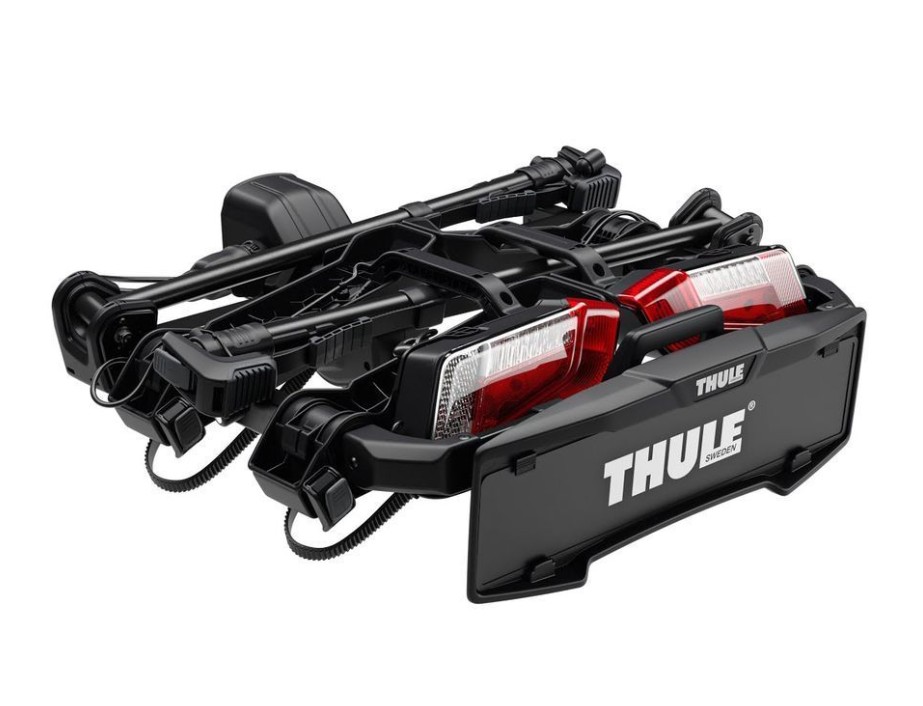 Der Thule OutPace bietet Platz für bis zu zwei Fahrräder und ist mit einer speziellen Klappfunktion ausgestattet, die den Platzbedarf beim Abstellen reduziert und das Schadensrisiko minimiert. Integrierte Lampen sorgen für Sichtbarkeit und Sicherheit.