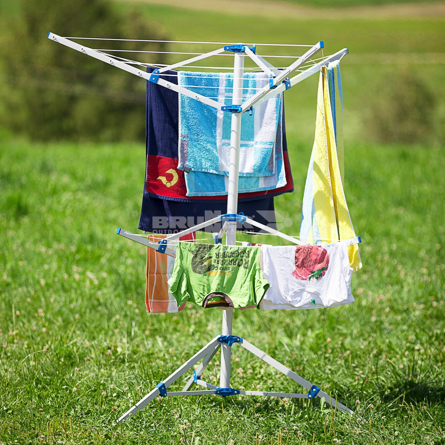 Inhalt: 1 Ständer inkl. TascheFarbe: silberMaterial: AluminiumMasse BxH: 130 x 150 cmGewicht: 2.3 kg- Wäschespinne aus eloxi…